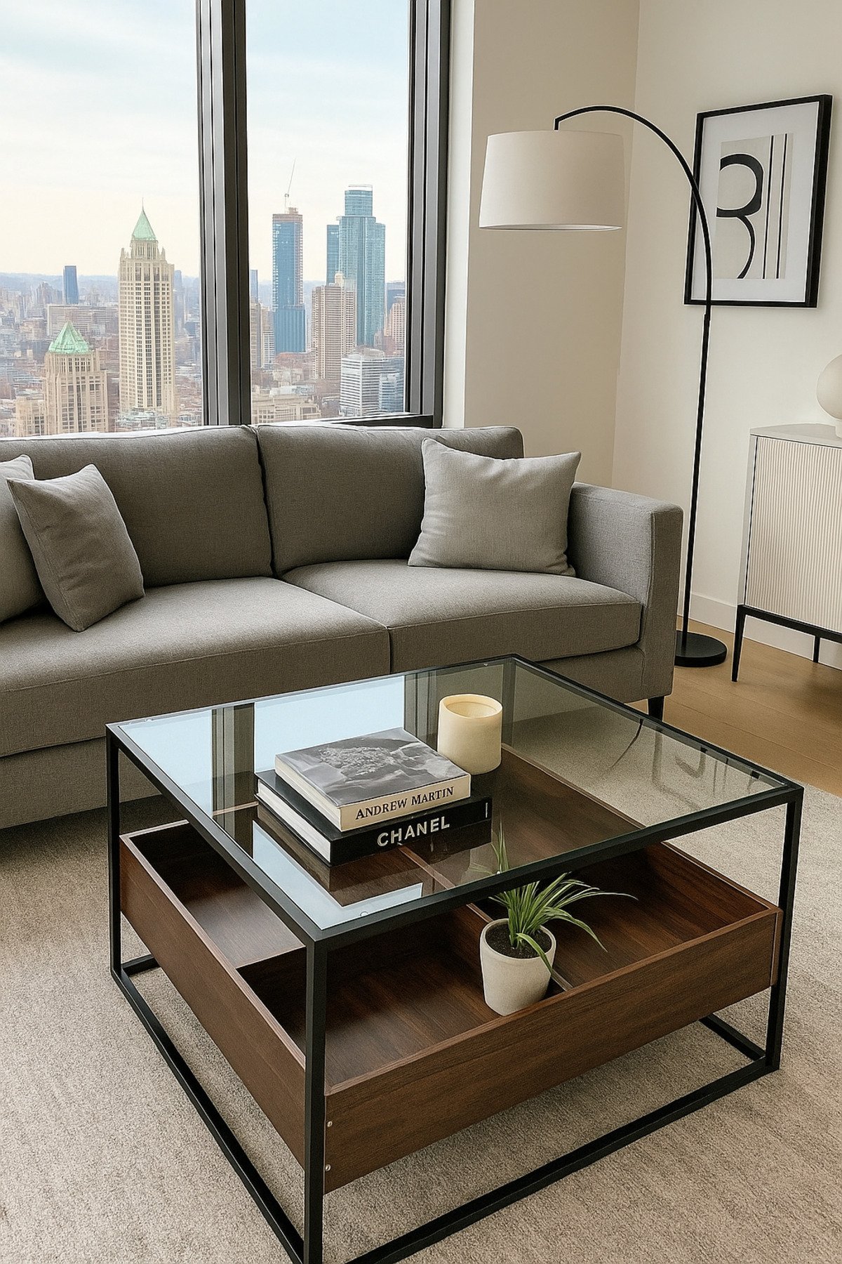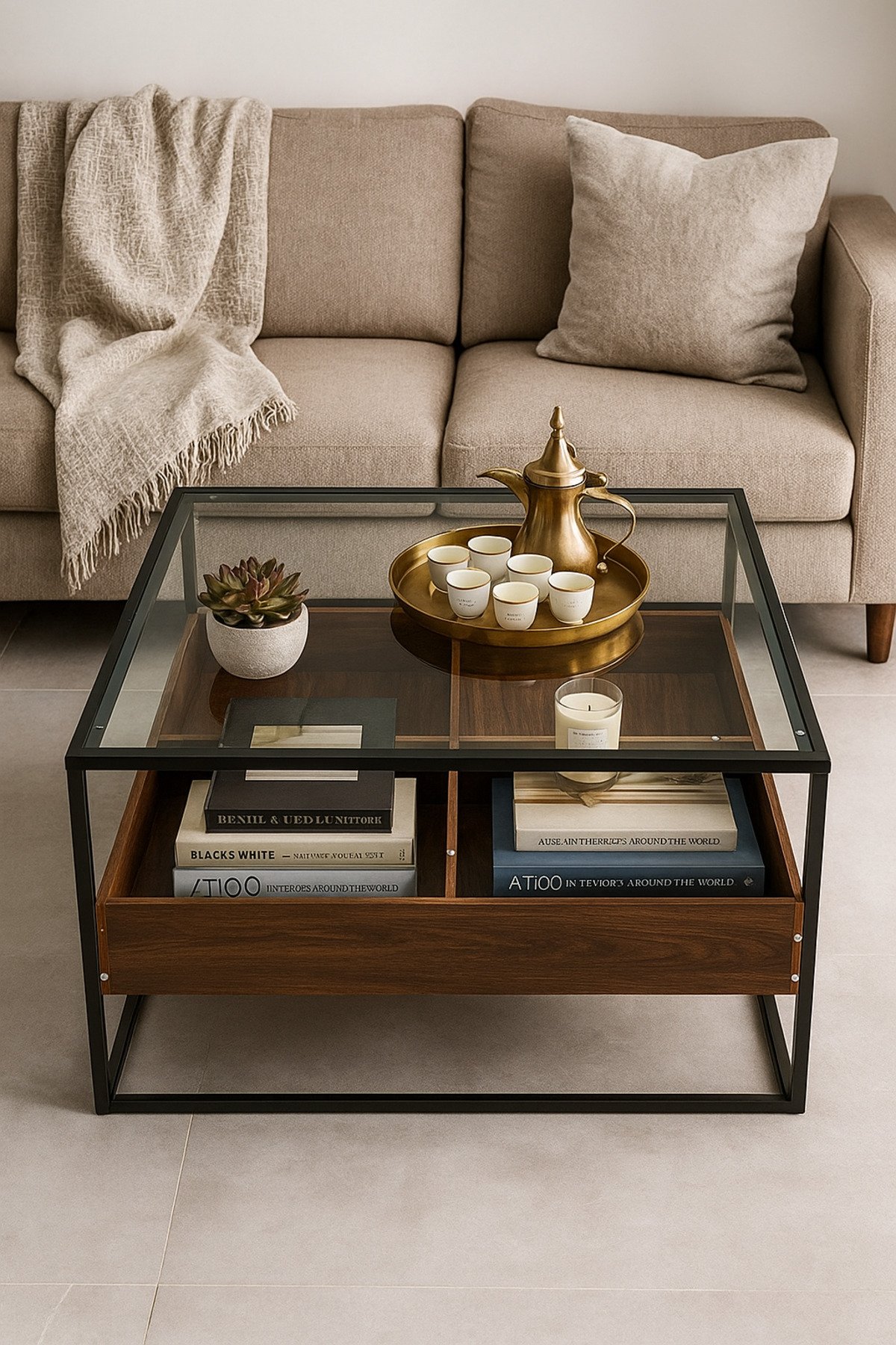طاولة قهوة زجاجية عصرية مع حجرات تخزين خشبية وإطار أسود - 80×80×45 سم