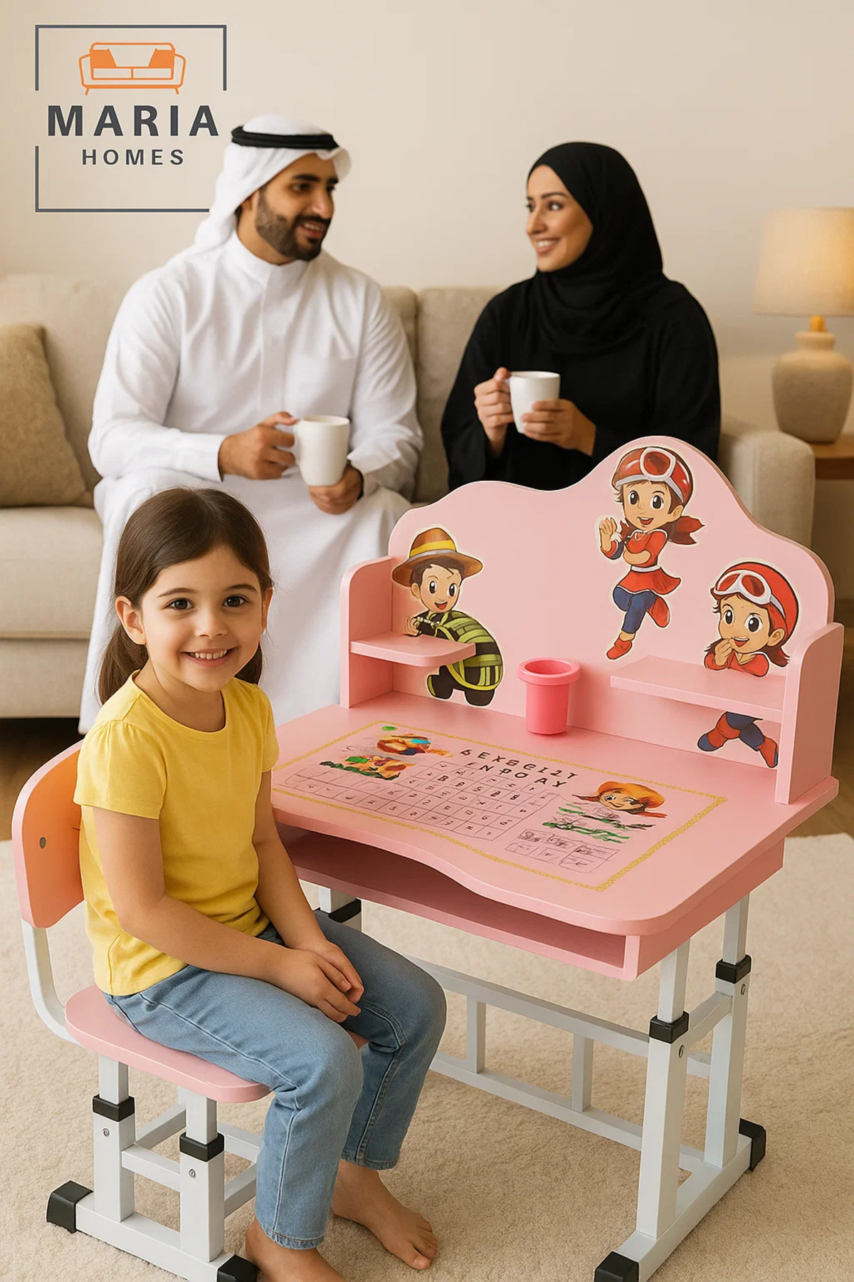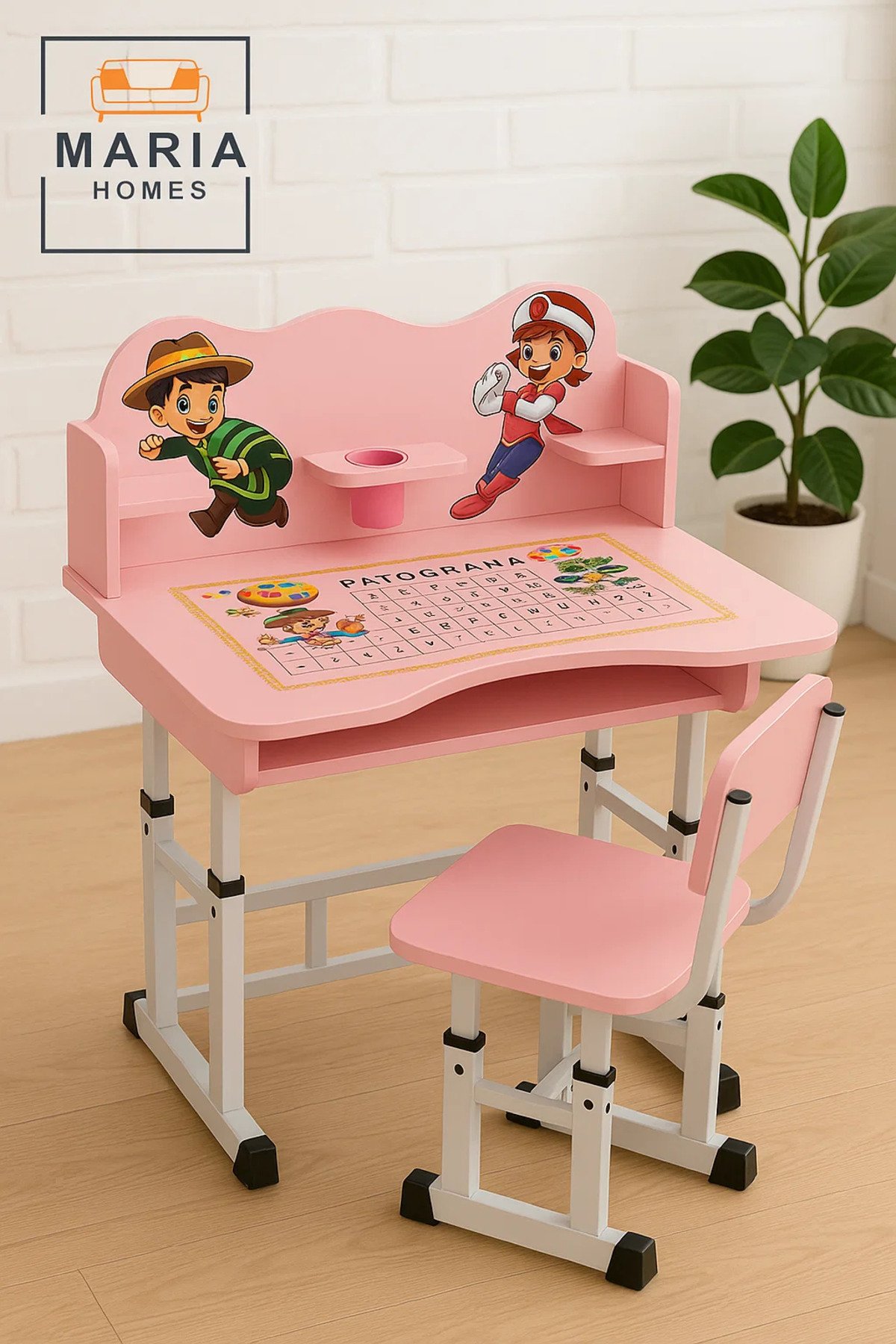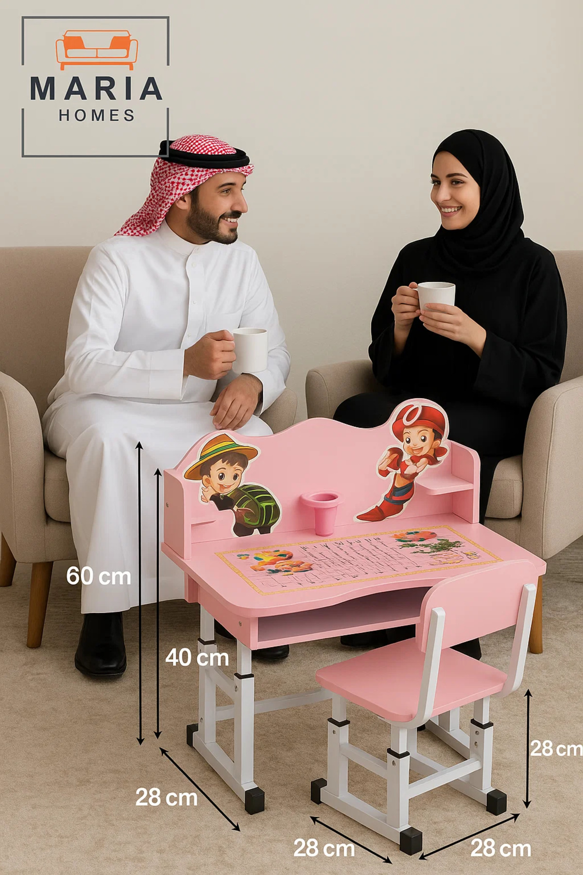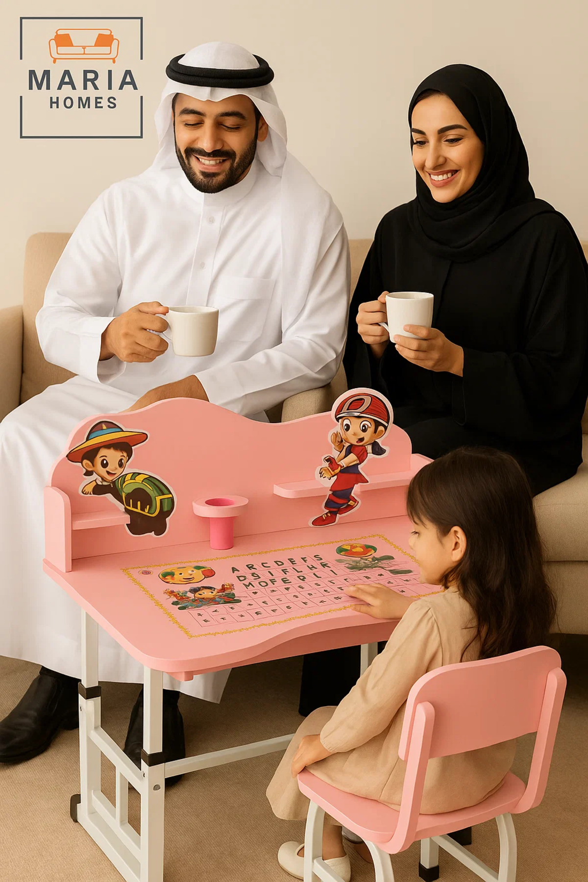 طقم مكتب وكرسي دراسة للأطفال باللون الوردي بتصميم كرتوني وسطح طاولة بأحرف أبجدية
