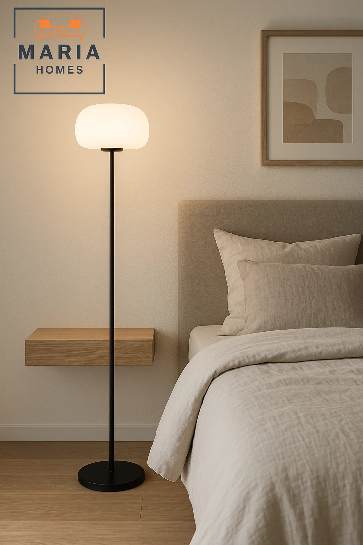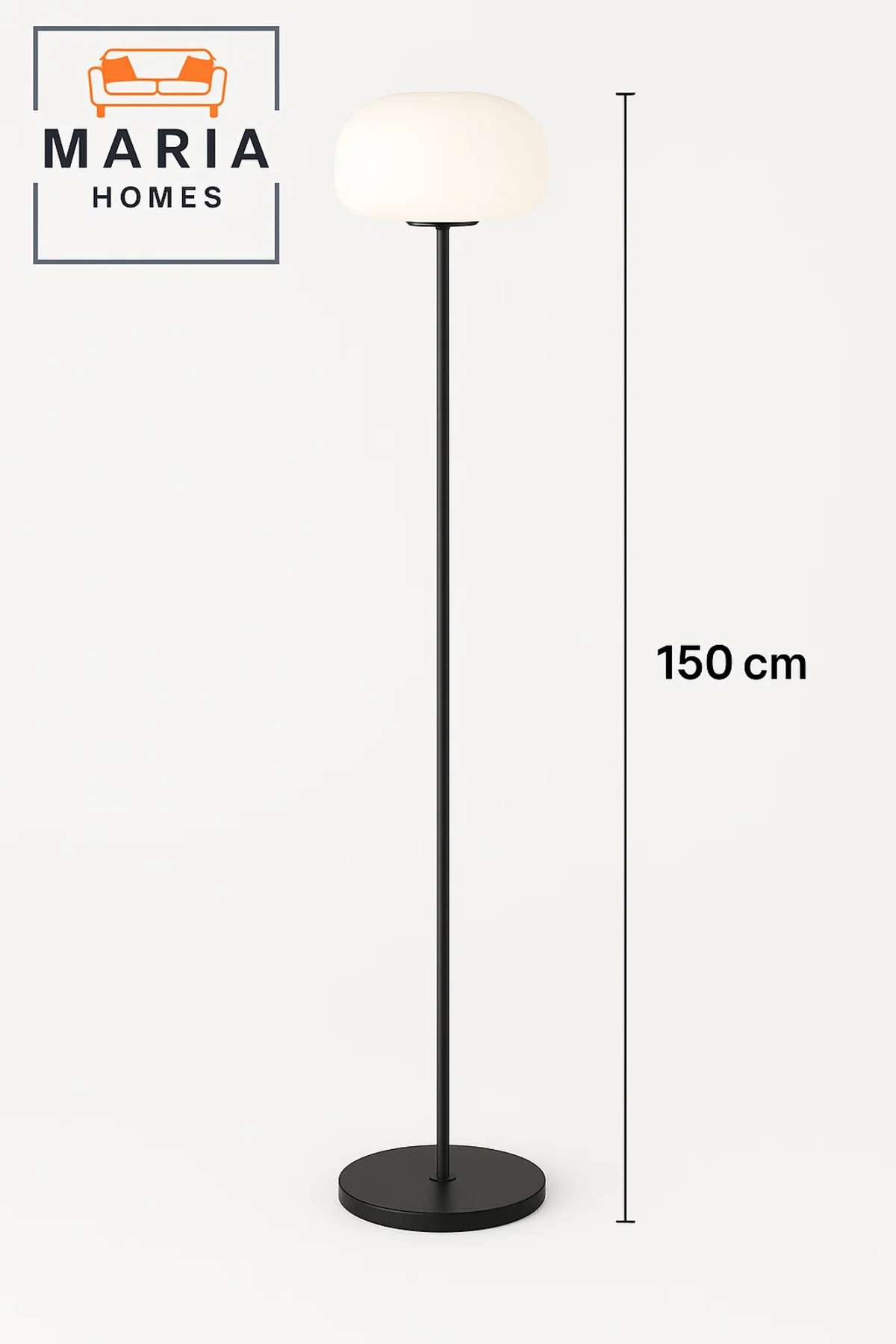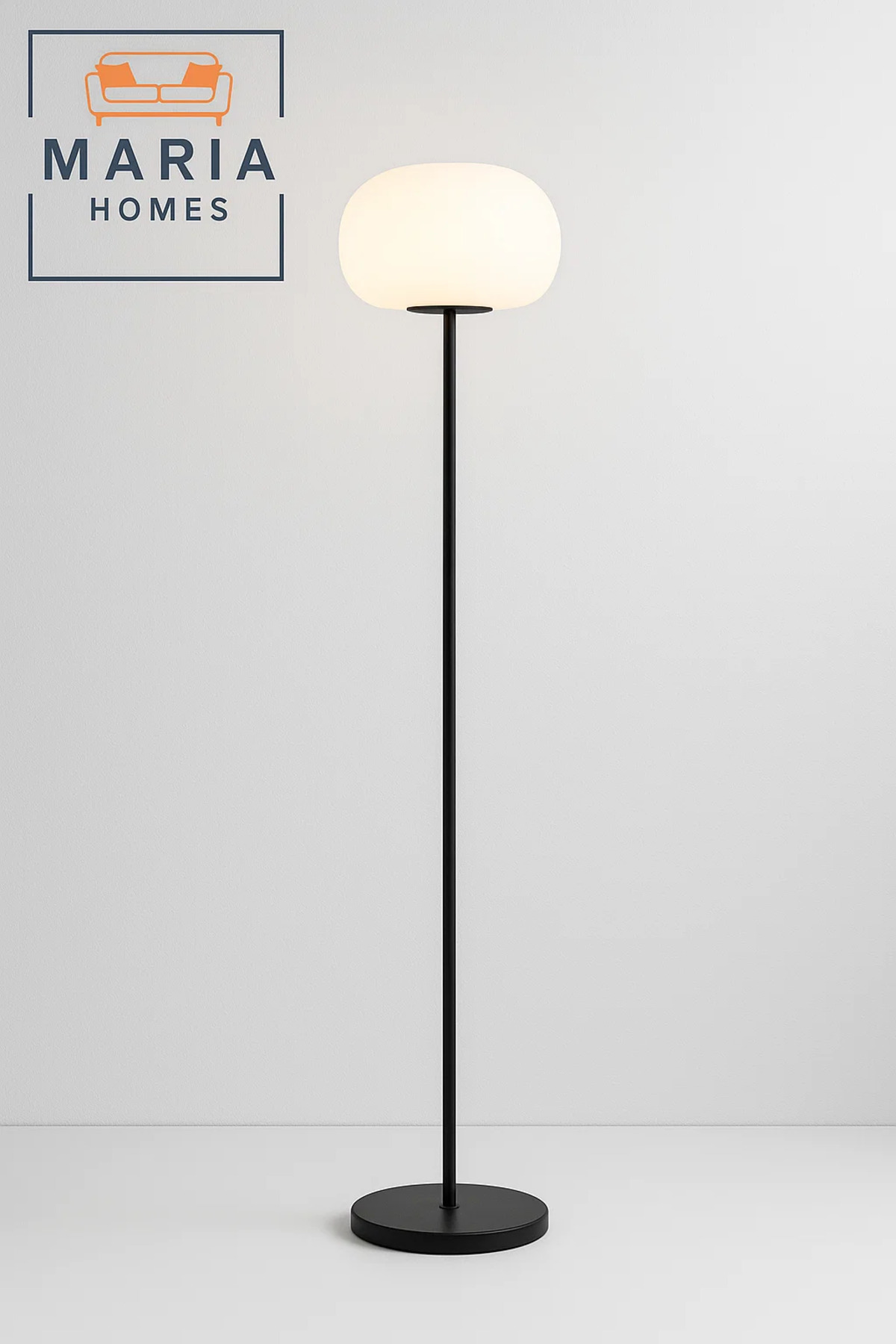 مصباح أرضي طويل يتميز بغطاء بيضاوي مضلع باللون الأبيض وقاعدة سوداء أنيقة. مثالي لغرف المعيشة الأنيقة.