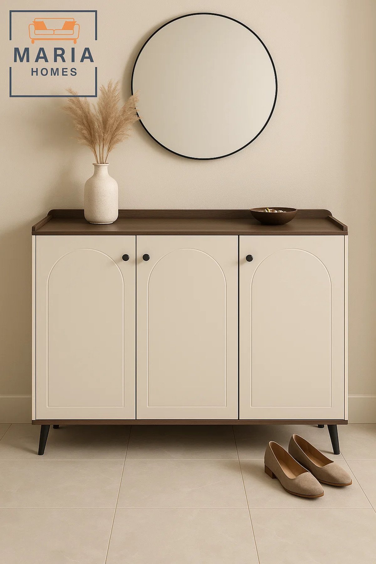 خزانة أحذية كبيرة بثلاثة أبواب بلون كريمي مع ألواح مقوسة، رف تخزين أحذية عصري أنيق للمداخل