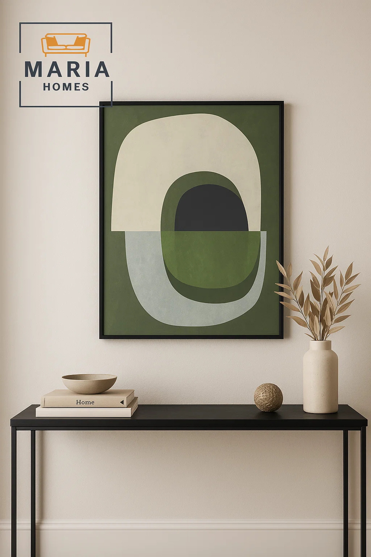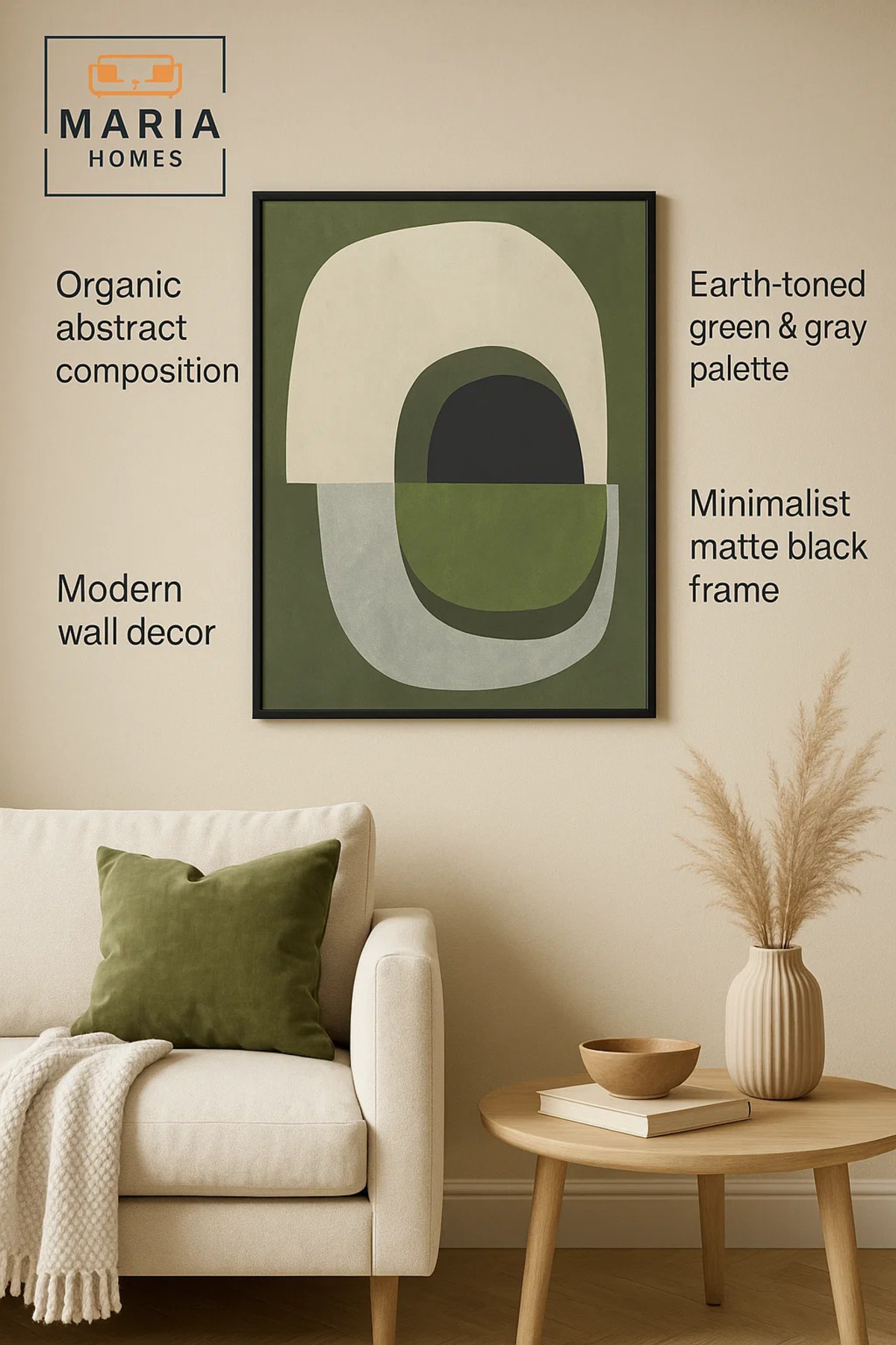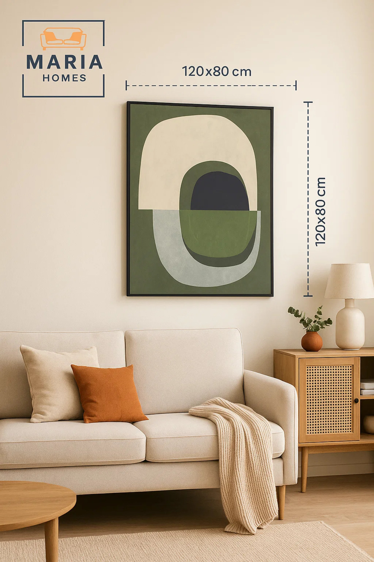 لوحة فنية تجريدية مؤطرة - أشكال عضوية خضراء ومحايدة، مقاس 120*80 سم