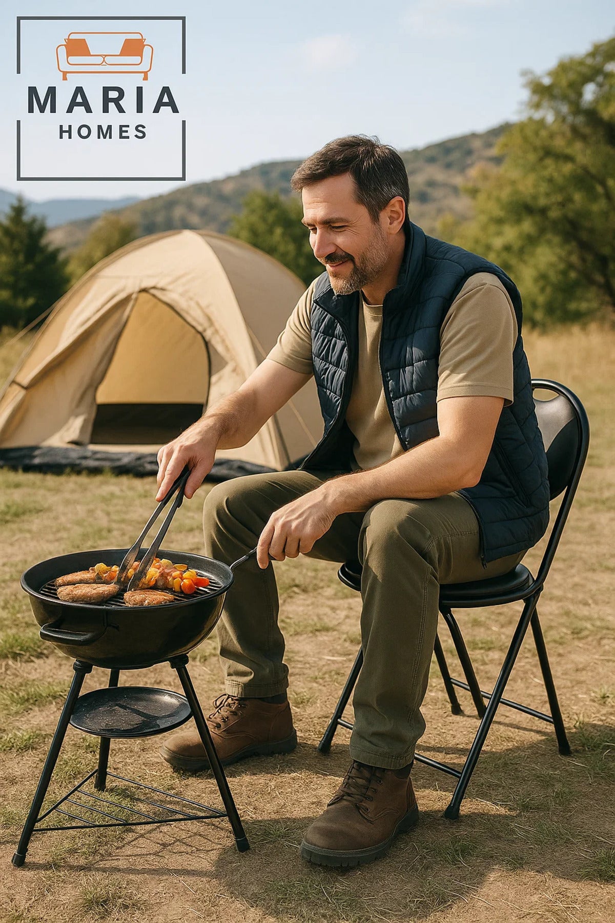 Maximize comfort and space with this compact black round folding chair, designed with a cushioned seat and padded backrest.; The sleek black metal frame ensures stability while the ergonomic design supports all-day use.; Ideal for homes, events, offices, or extra guest seating, this chair folds easily for convenient storage and transport.; Lightweight yet durable, itÕs perfect for indoor and occasional outdoor use.; Whether for a quick meal, extra seating at a gathering, or a portable office setup, this space-saving chair offers stylish functionality and everyday convenience.; A practical solution for modern living